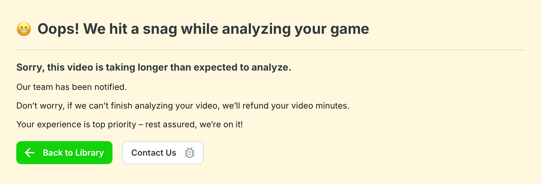 Removing or hiding a video does not return minutes. If you hit an analysis issue, contact us with a link to the video so we can help.