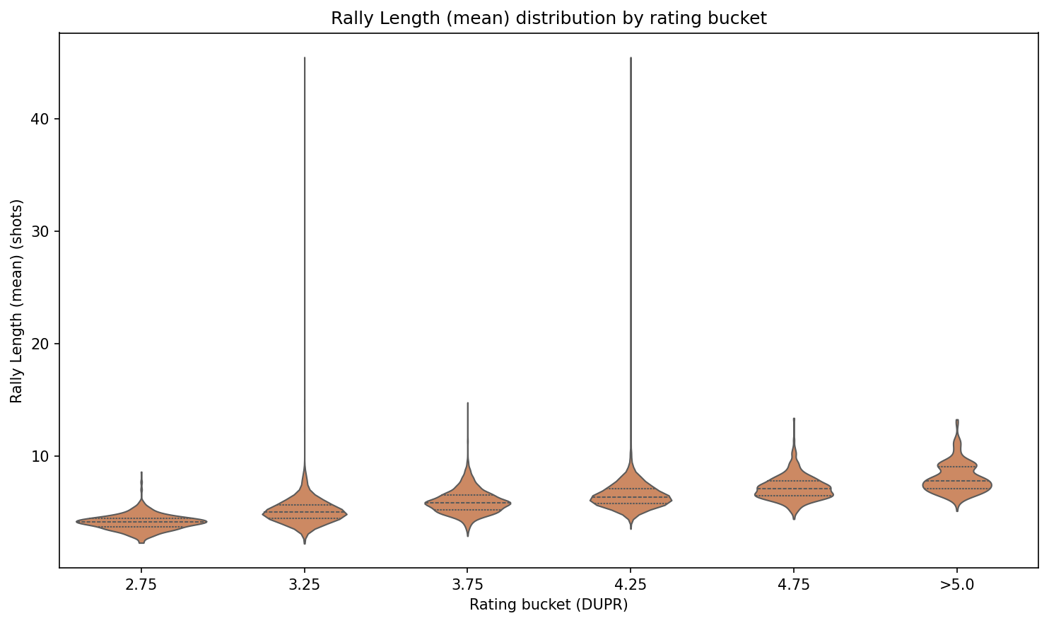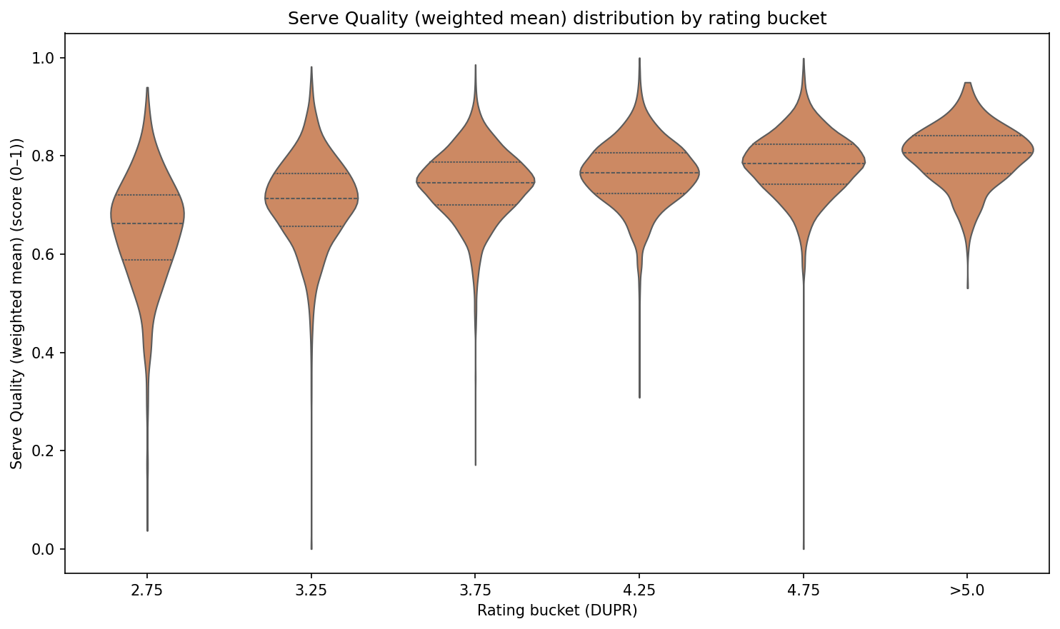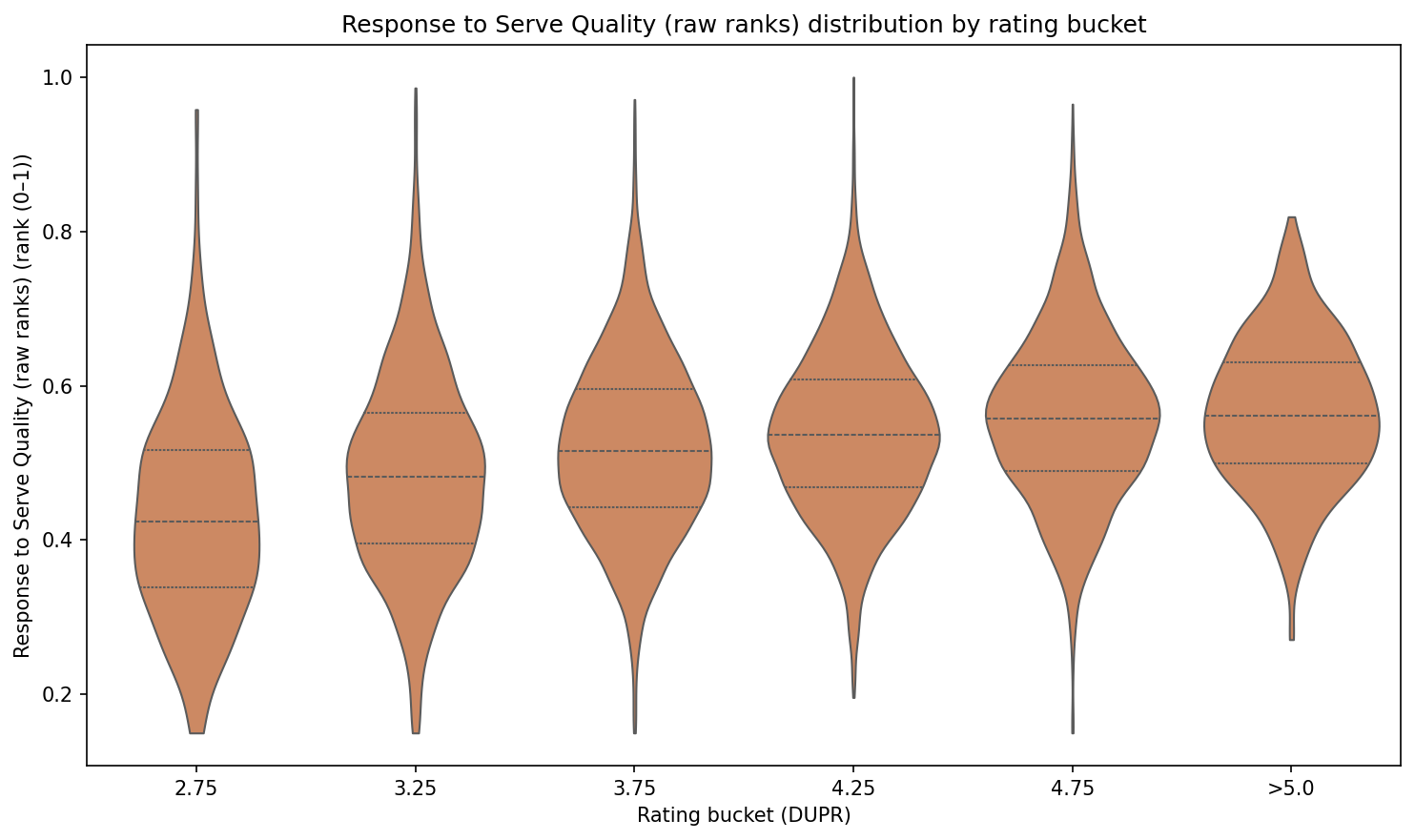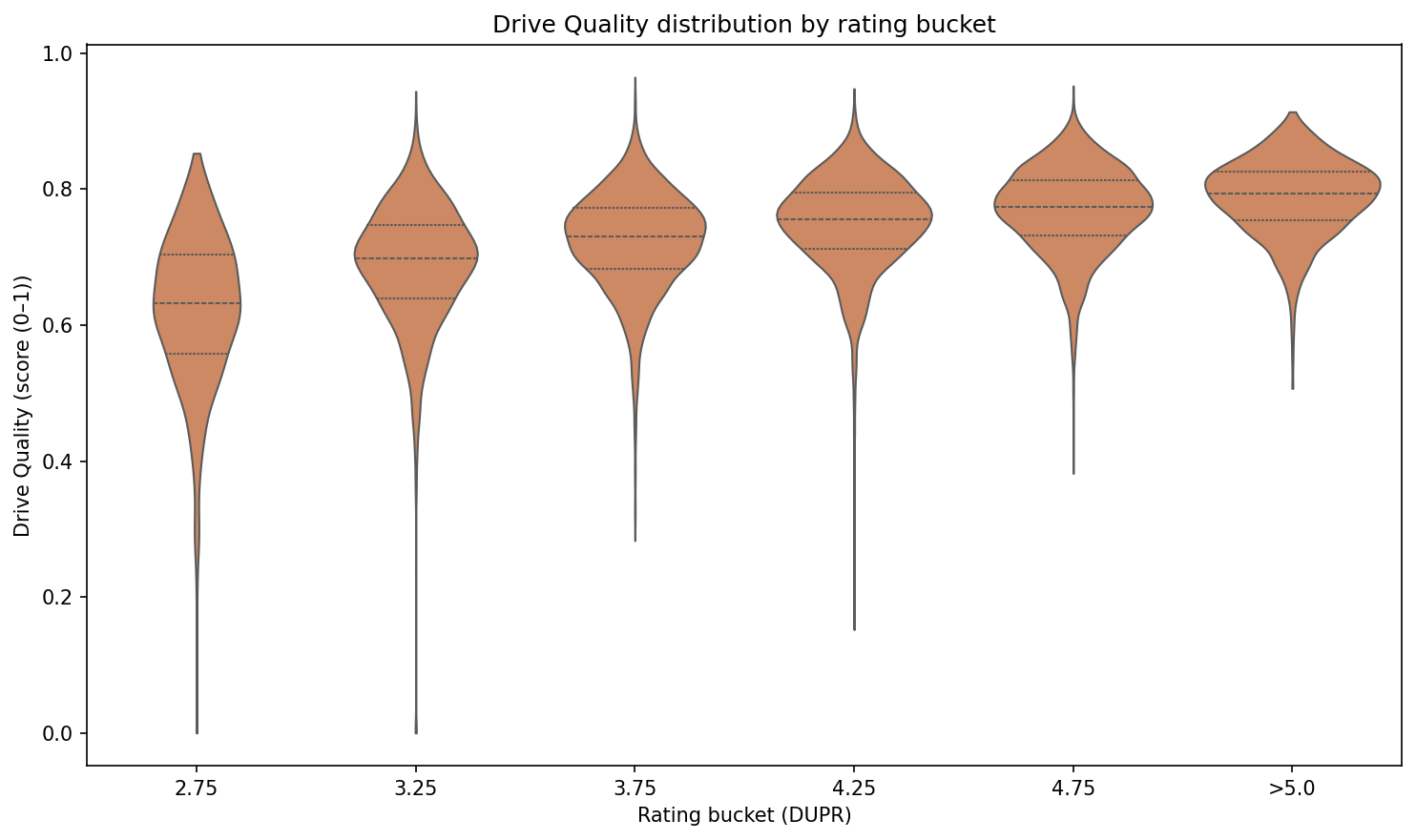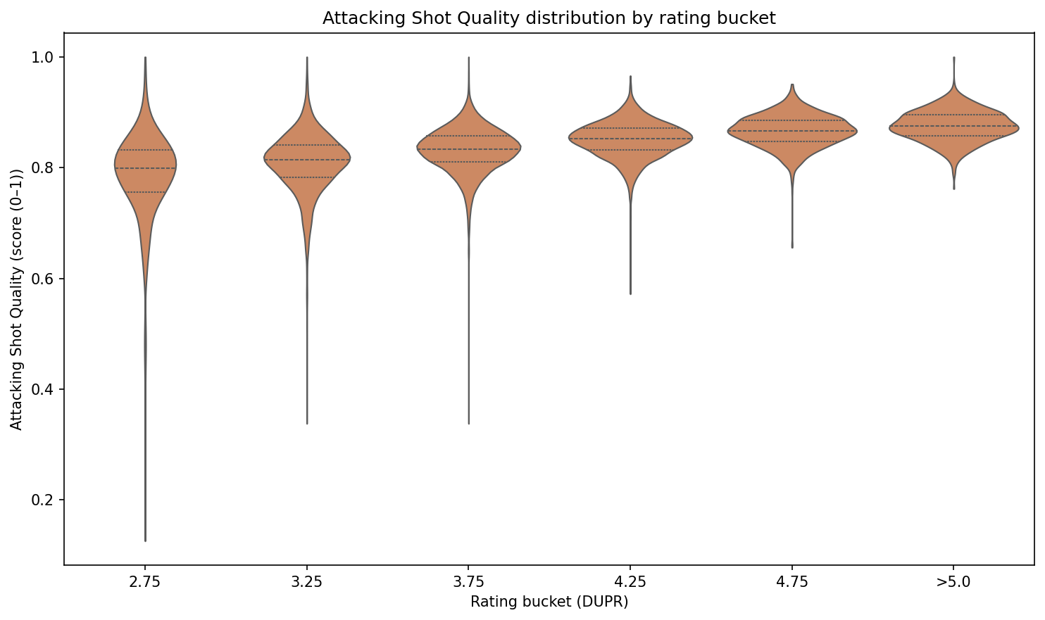 At amateur levels (2.0–5.0), physical skills like movement and shot quality have the biggest impact. At higher levels, subtle differences in strategy and shot selection matter more. Ratings currently cap at 5.5, which reflects the upper limit of what our model can confidently assess.
