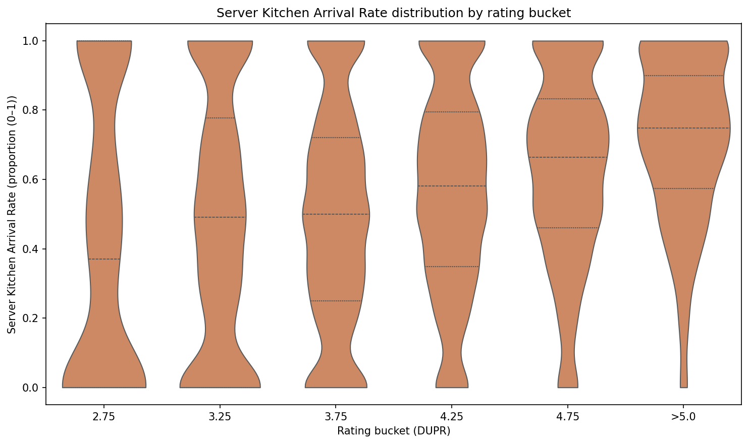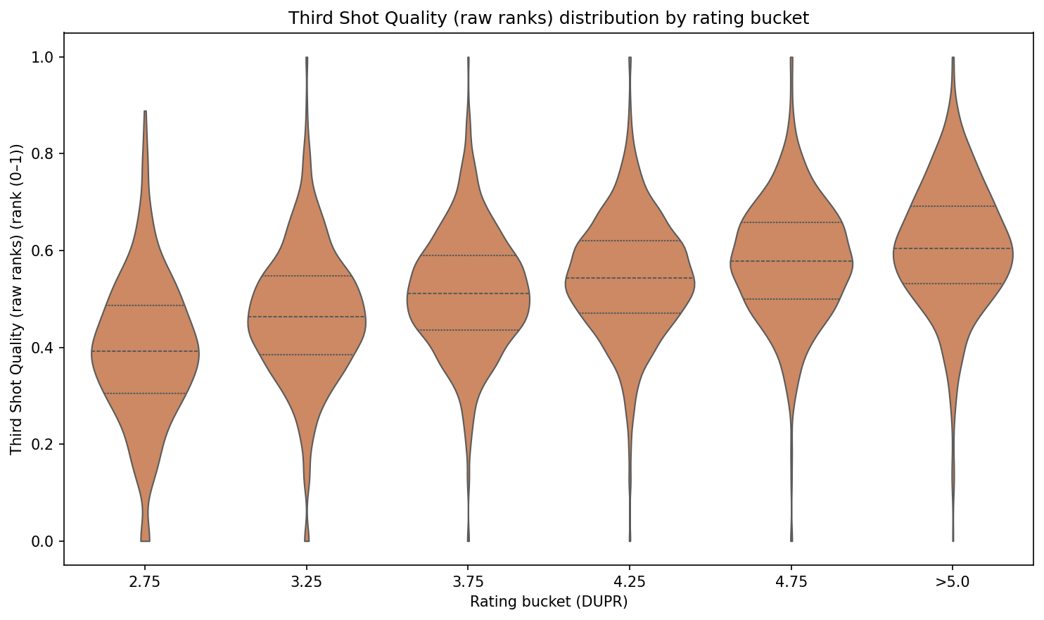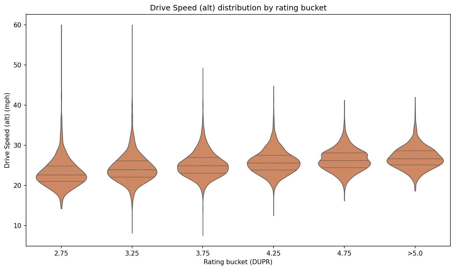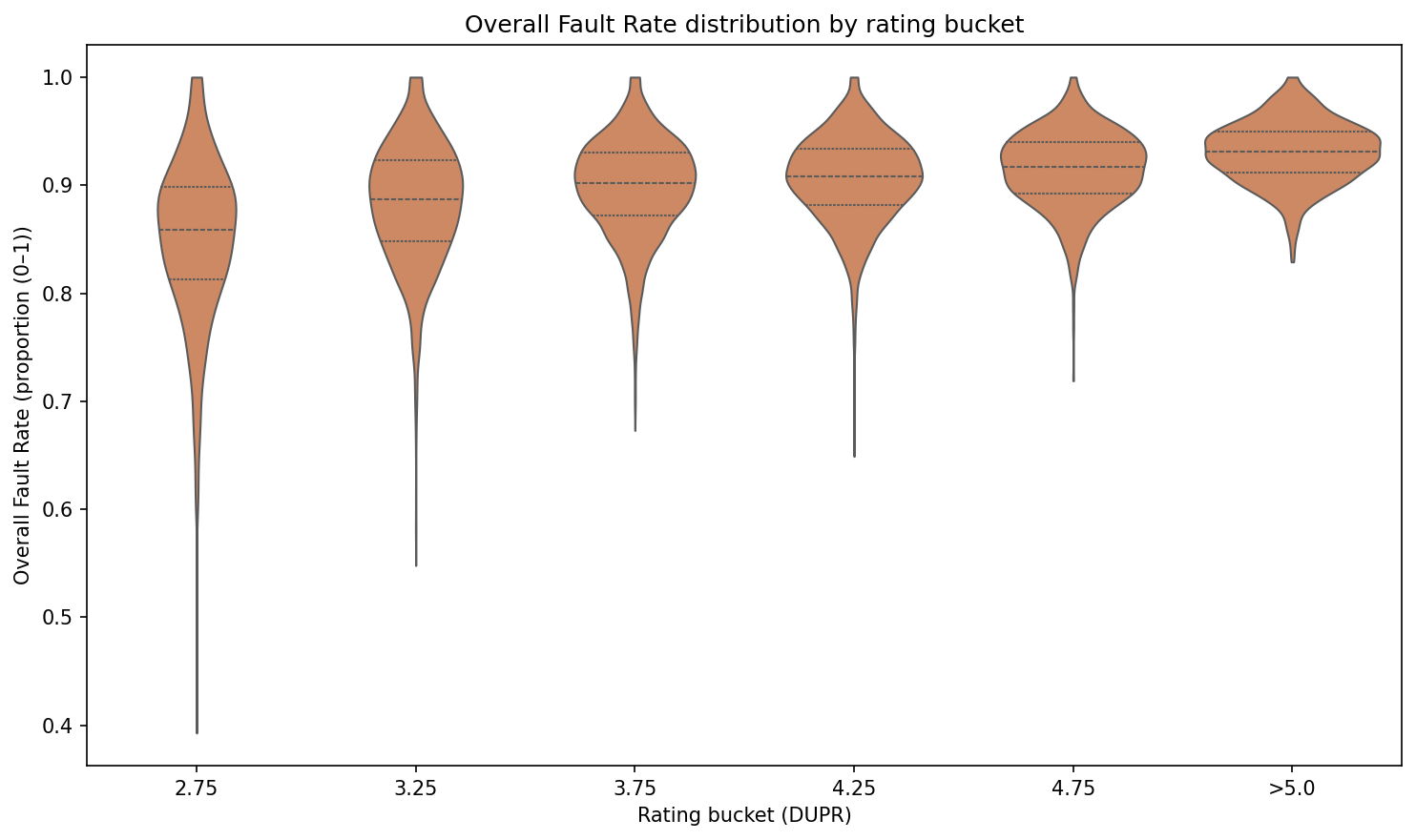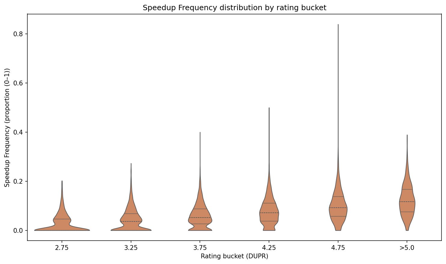 At amateur levels (2.0–5.0), physical skills like movement and shot quality have the biggest impact. At higher levels, subtle differences in strategy and shot selection matter more. Ratings currently cap at 5.5, which reflects the upper limit of what our model can confidently assess.