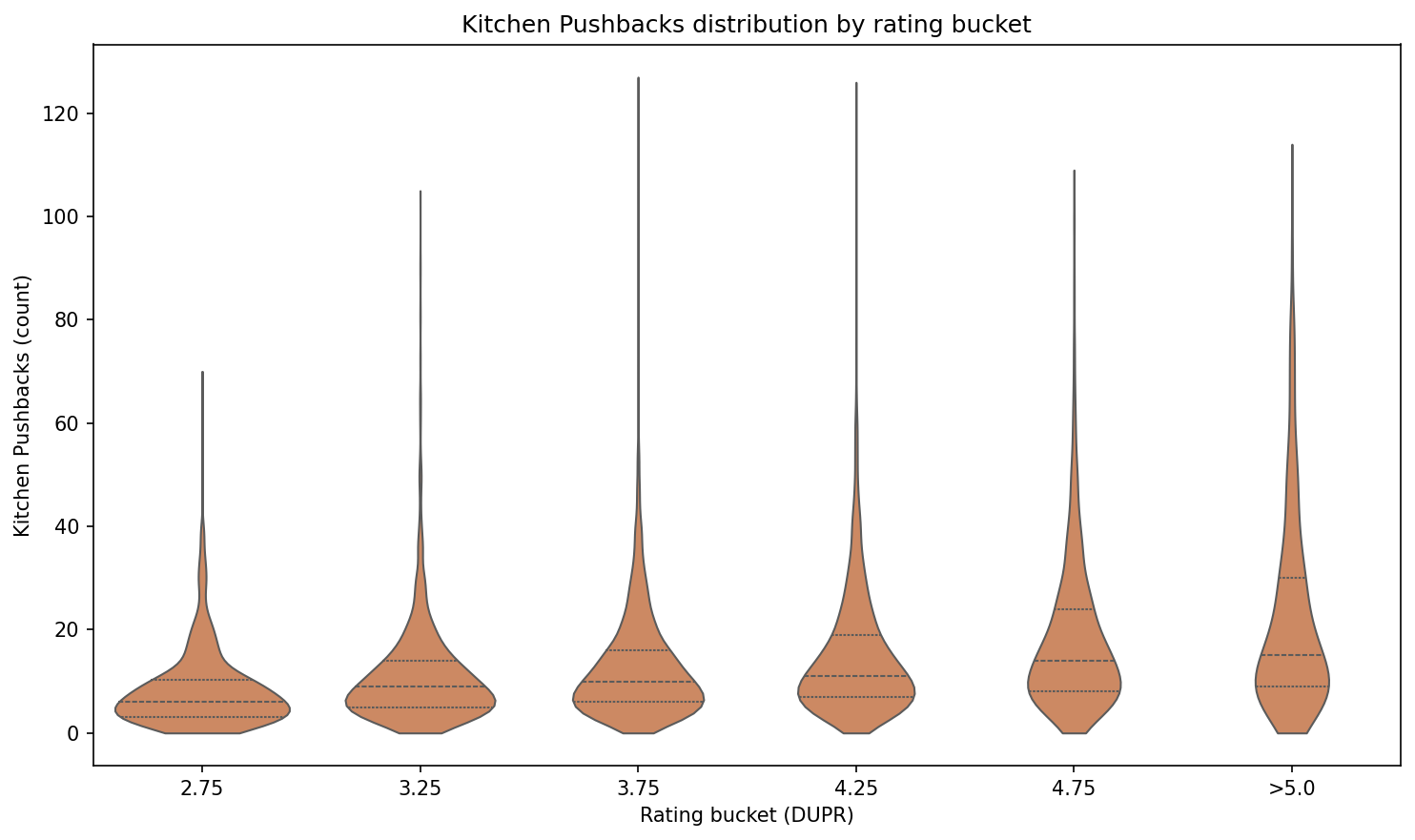 We measure: Reset frequency, quality, depth, and speed; dink quality; kitchen line stability; how often you return to kitchen after being pushed back; how often your defense pushes opponents back; and how poorly opponents respond to your dinks, drops, and speedups.